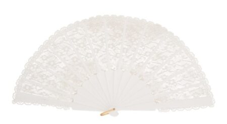 Abanico con varillas de plástico y encaje blanco, ideal para Novias o para eventos especiales. Este accesorio aporta romanticismo a tu traje. Tamaño mediano, mide 23 cm cerrado.