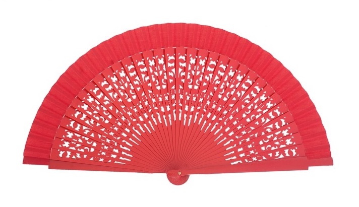 Abanico español mediano con varillas caladas, fabricado en madera y tela. Tamaño mediano, mide 23 cm cerrado. Utilizado para la calle, ocasiones especiales, para el baile flamenco, danzas españolas, danzas tribales.