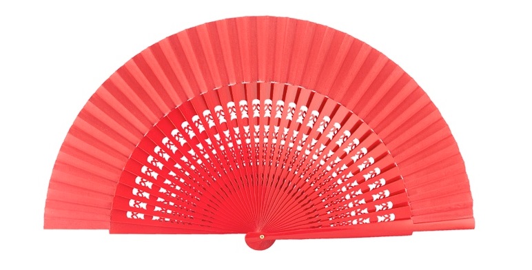 Abanico español mediano con varillas caladas, fabricado en madera y tela. Tamaño mediano, mide 23 cm cerrado. Utilizado para el baile flamenco, danzas españolas, danzas tribales o para la calle.