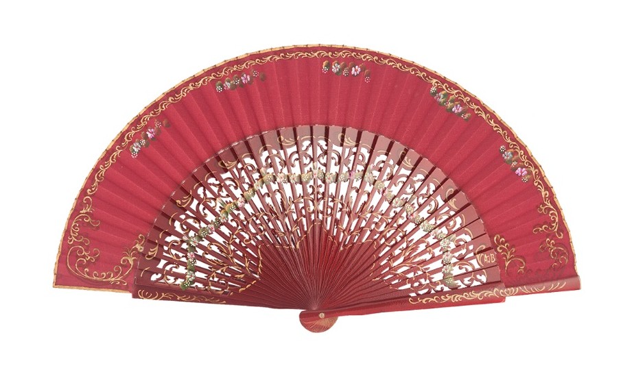 Abanico Pintado a Mano burdeo flores pequeñas (23 cm)