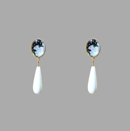 Novedosos y elegantes pendientes de gota con cabujón rosas blancas. Largo 5,5 cm.
