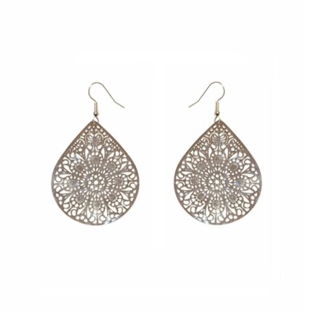 Pendientes metálicos con calados de filigrana. Muy livianos. Largo total 6 cm.