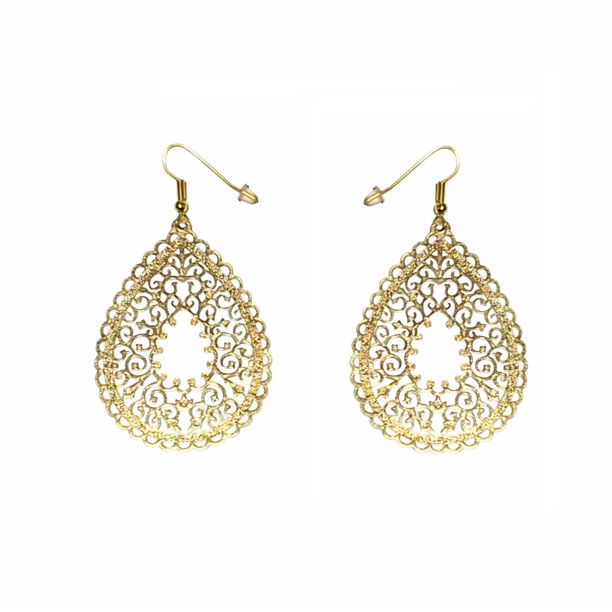 Pendientes metálicos con calados de filigrana. Muy livianos. Largo total 6 cm.