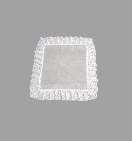Hermoso pañuelo de algodón con borde de encaje blanco, fabricado a mano. Se utiliza encaje elasticado de textura suave y flexible. Tamaño total 45×45 cm.