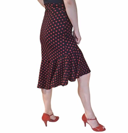 Falda corta, llega hasta abajo de la rodilla. Tela elasticada, muy cómoda y versatil. El tamaño del lunar puede variar en cada partida.