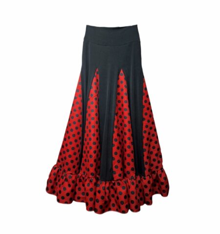 Falda de flamenco fabricada en tela elasticada con volante en tela rígida, corte tradicional, ruedo amplio. Ideal para clases y presentaciones de flamenco.