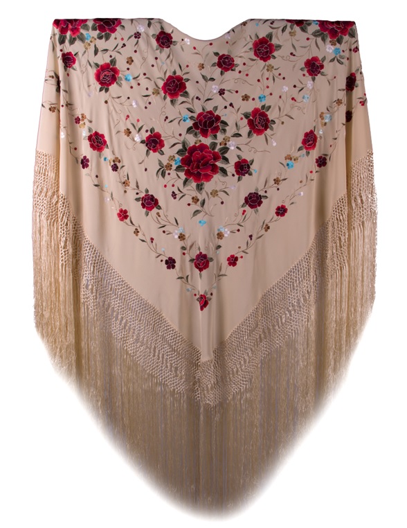 Mantón de Manila español de seda, bordado a mano, cuadrado grande, excelente peso, ideal para baile. Este mantón, fabricado artesanalmente en España, se utiliza como complemento para el baile flamenco, danzas tribales, bailes andaluces y españoles en general. También, es un accesorio maravilloso para novias, madrinas o invitadas a matrimonios, fiestas, o eventos especiales. Consulta por convenios con tu escuela de baile.