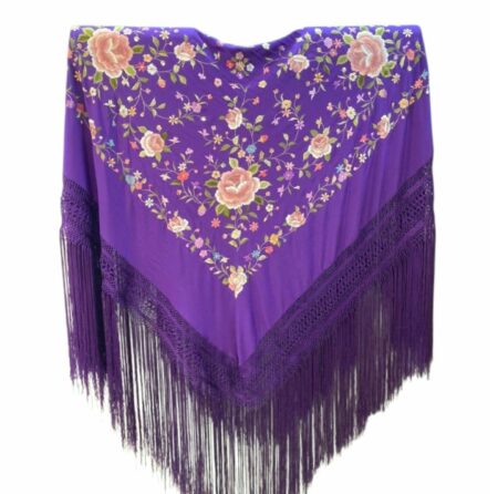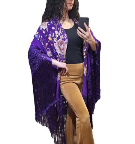 Mantón de Manila español de seda, bordado a mano, cuadrado grande (135×135 cm más flecos largos app 65 cm con rejilla), excelente peso, ideal para baile. Este mantón, fabricado artesanalmente en España, se utiliza como complemento para el baile flamenco, danzas tribales, bailes andaluces y españoles en general. También, es un accesorio maravilloso para novias, madrinas o invitadas a matrimonios, fiestas, o eventos especiales. Consulta por convenios con tu escuela de baile.