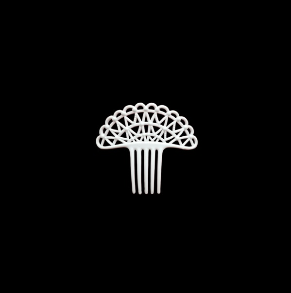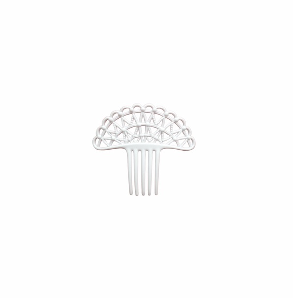 Peineta de plástico. Alto total 8 cm, alto sin peine 3,5 cm, ancho 7 cm.