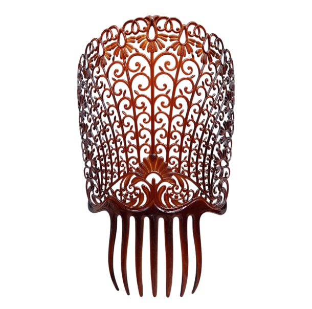 Peinetón de plástico color carey. Alto total 27 cm, ancho 21 cm. Dientes 8 x 7 cm.